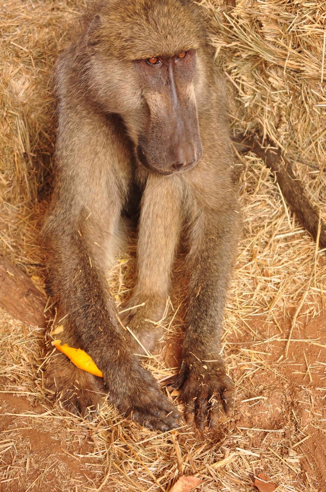 Yet he was still stiff and then his legs suddenly lost all feeling. He had movement in his arms but nothing in his legs. We began a course of massage treatment, massaging his legs every day using turmeric paste as an anti-inflamatory. He accepted two humans rubbing his legs, this incredible baboon, as he knew we were trying so hard to save him. During all of these weeks Joe would not give up: he would lip smack at the female baboons, call them in his very deep voice, and generally be alert and look around at all times.