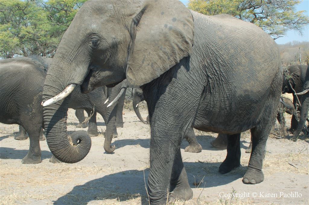Then we met up with Sharon Pincott, a past volunteer of Karen’s who works with the Presidential herd of elephants at Hwange. She agreed to take us with her to see the elephants, who as long as she was in her car, were all completely at home with her amongst them, and a couple of the females would even let her stroke their tusks and trunks. There were approximately 400 ellies in total, though they were broken down into family groups of around 30. Sharon had given each family group a letter, and then given the members of each family names that began with that initial. We got there as one of the families was leaving, and as they walked past the car, only a few of metres from us, you could see the trust in their eyes. It was an incredible feeling, and saddened me to think that if only people didn’t hurt them, we could have this relationship with so many different animals. We moved on in search of more ellies, and this time a young bull approached us. Sharon recognised a hole in his right ear and told us that he was called Leroy. As he had left his family group to live on his own, Sharon hadn’t seen him for several years, so he was a little wary, but clearly still remembered her. Kate and Rafael threw acacia pods to him, encouraging him to come closer, and soon he was only a couple of metres away. He was a magnificent beast. He moved on and we found another family, complete with tiny calves. We got some brilliant photos.